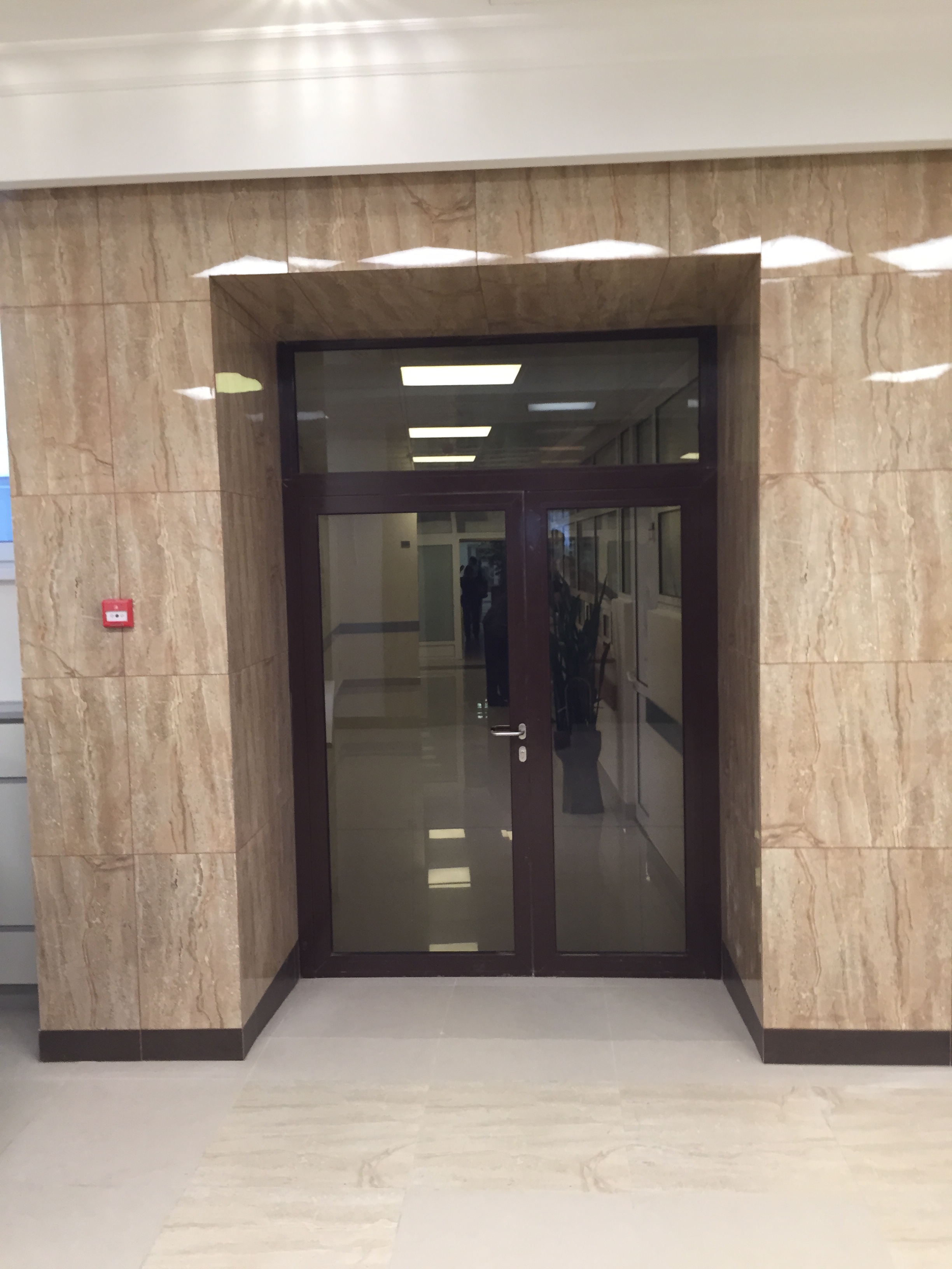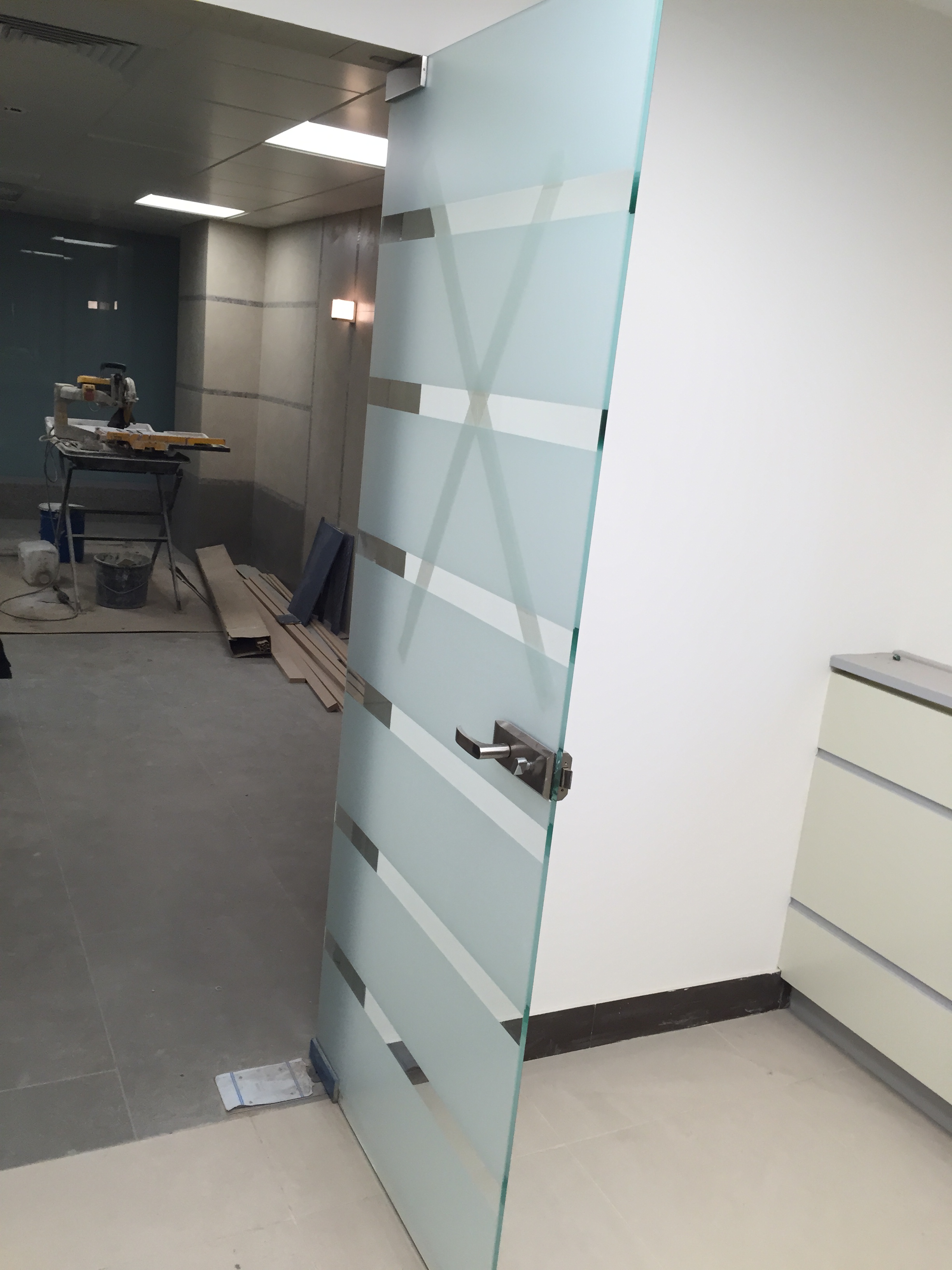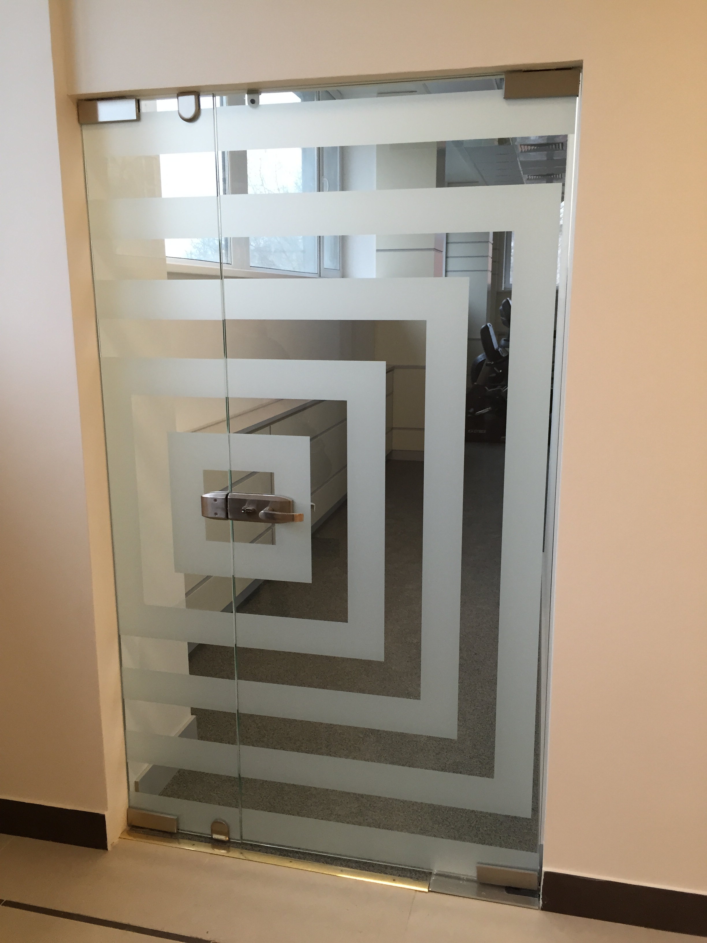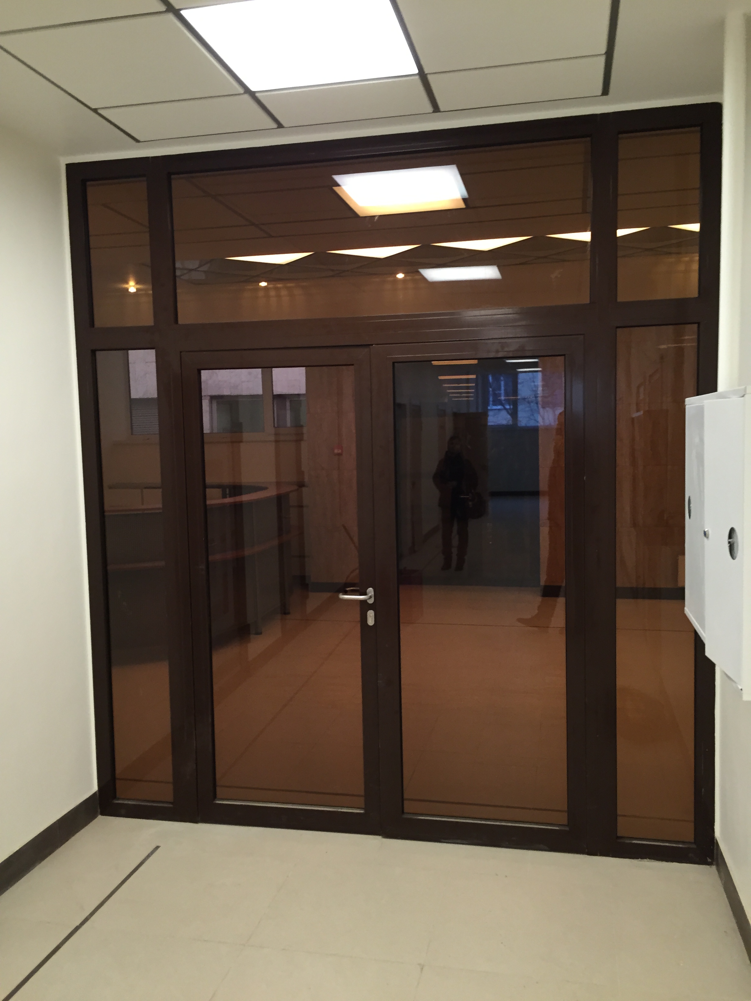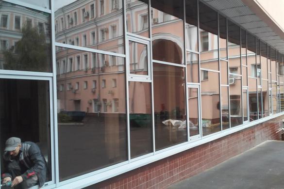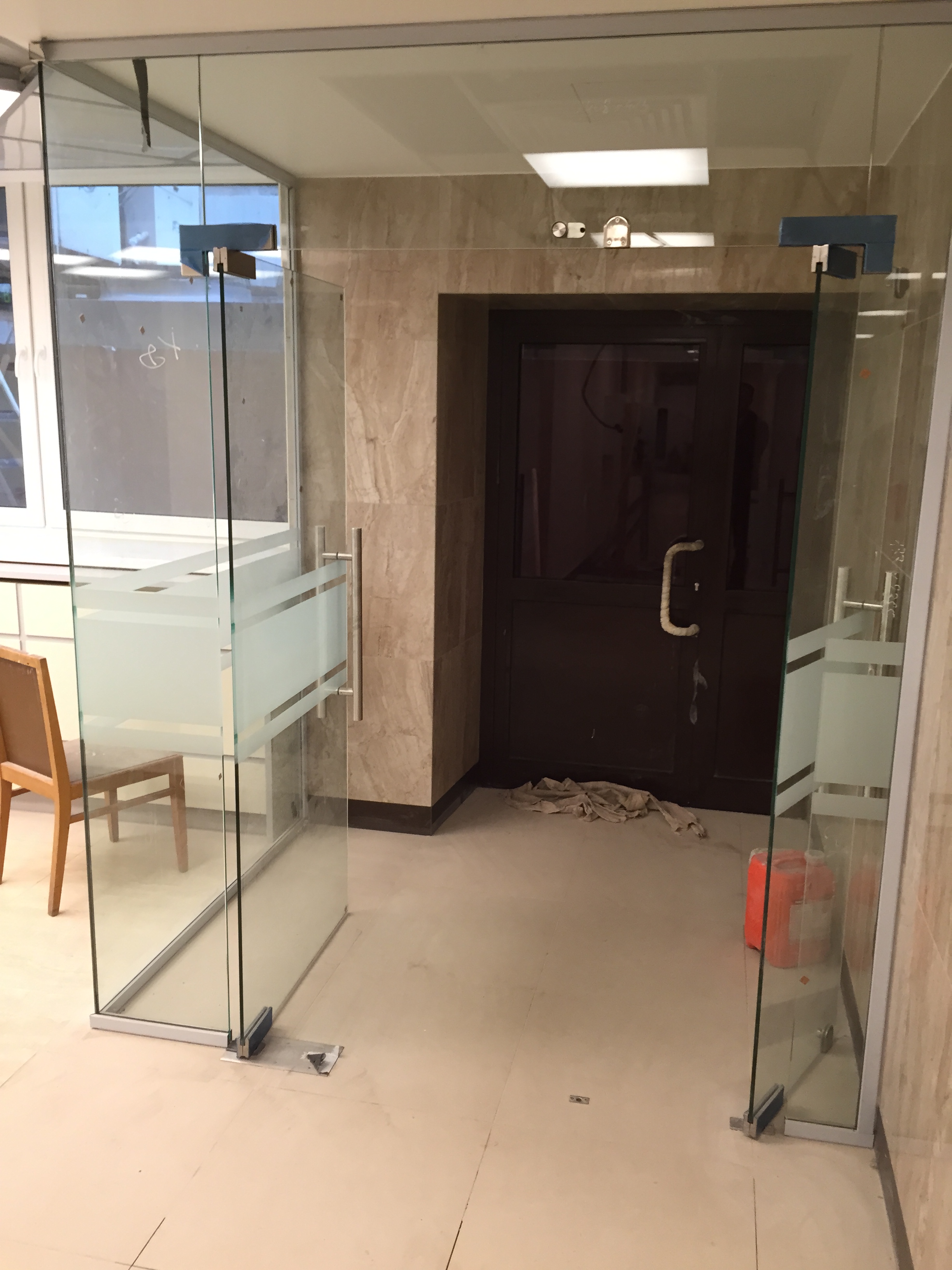 Установка цельно-стеклянных дверей и конструкций из алюминиевого профиля окрашенного порошковой краской. Остекление на дверях задекорировано матовой пленкой.