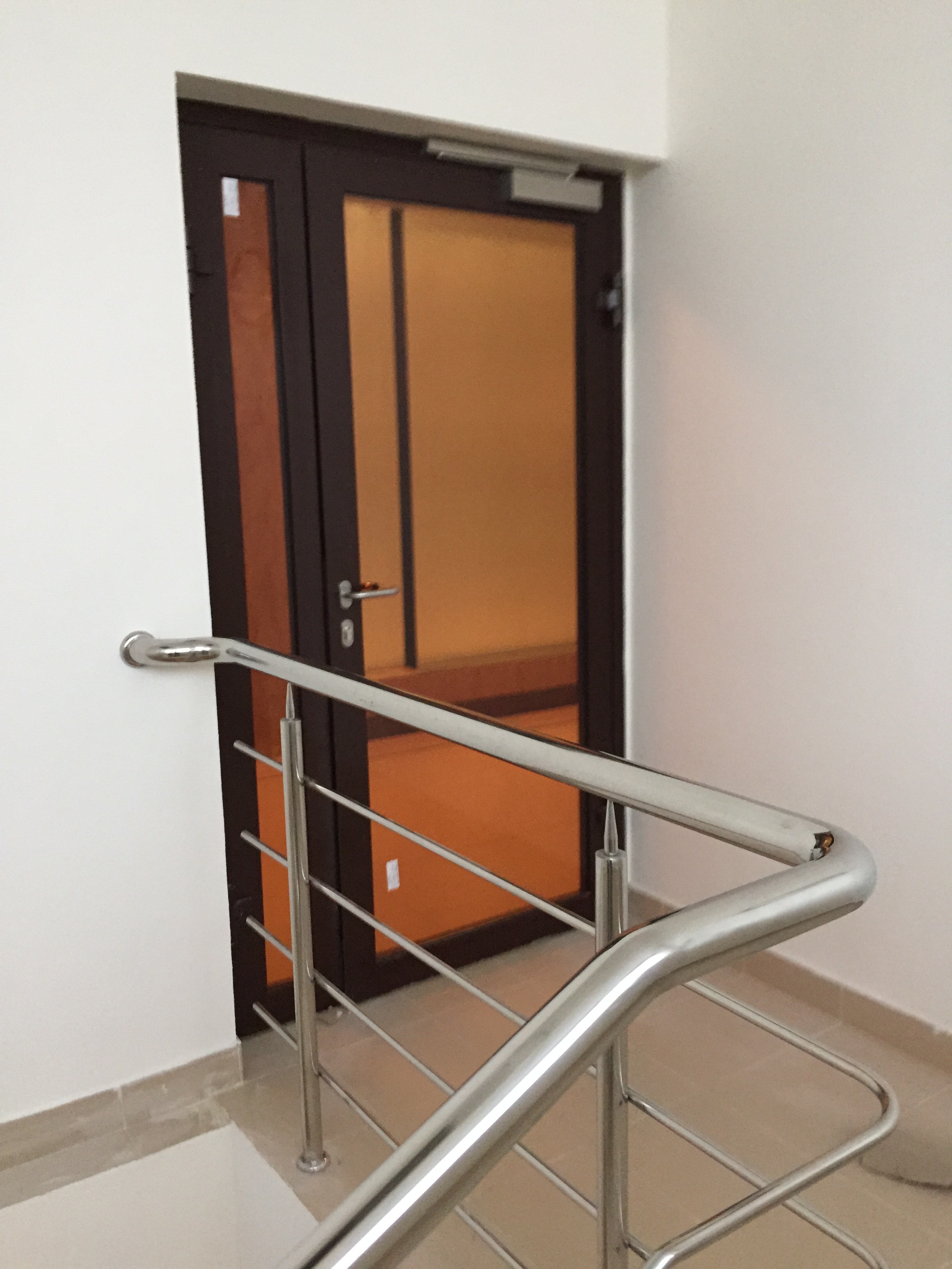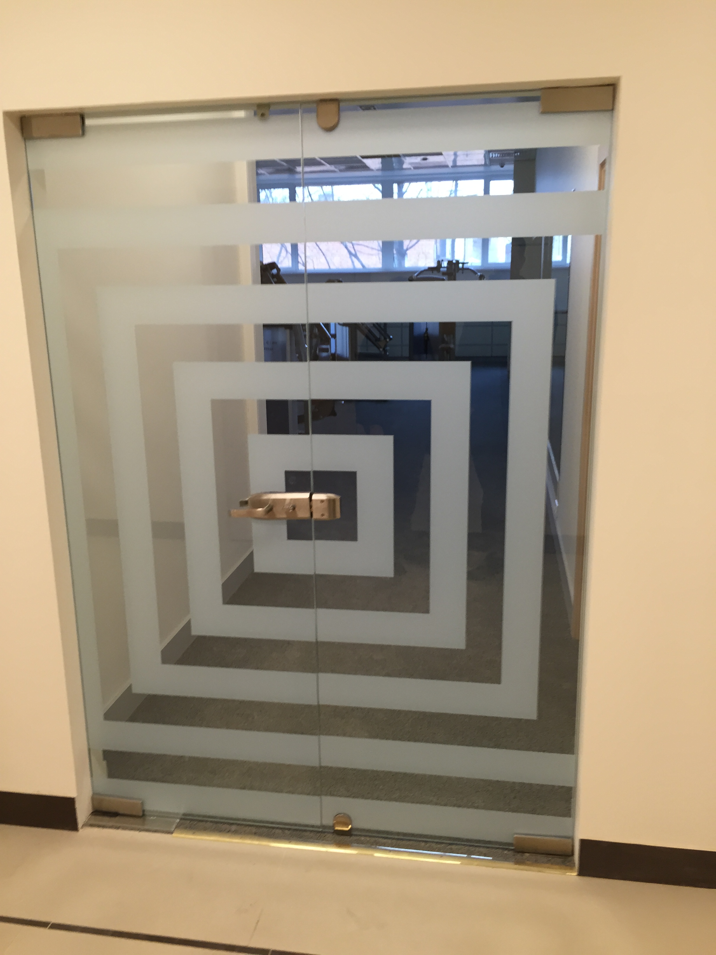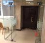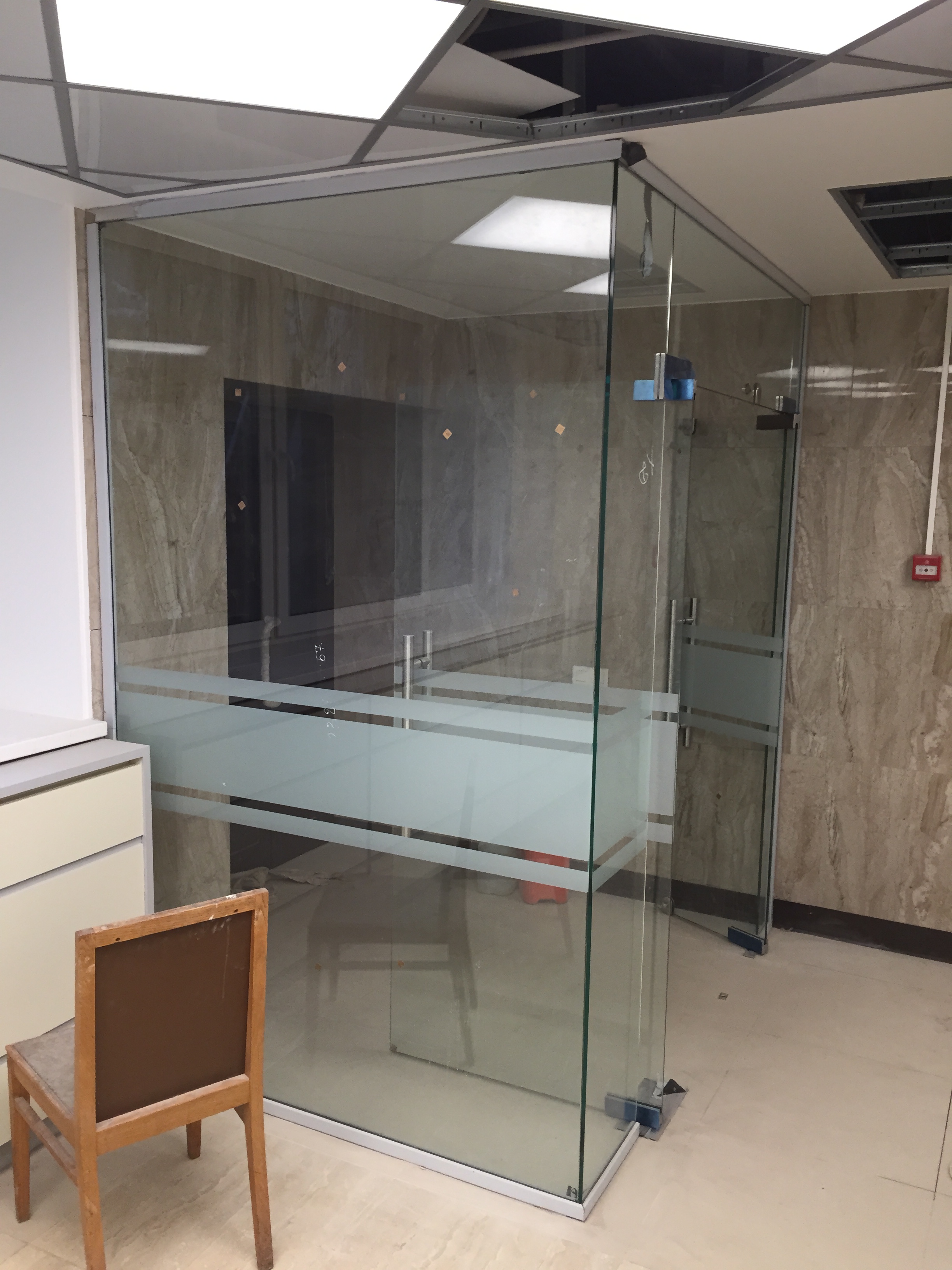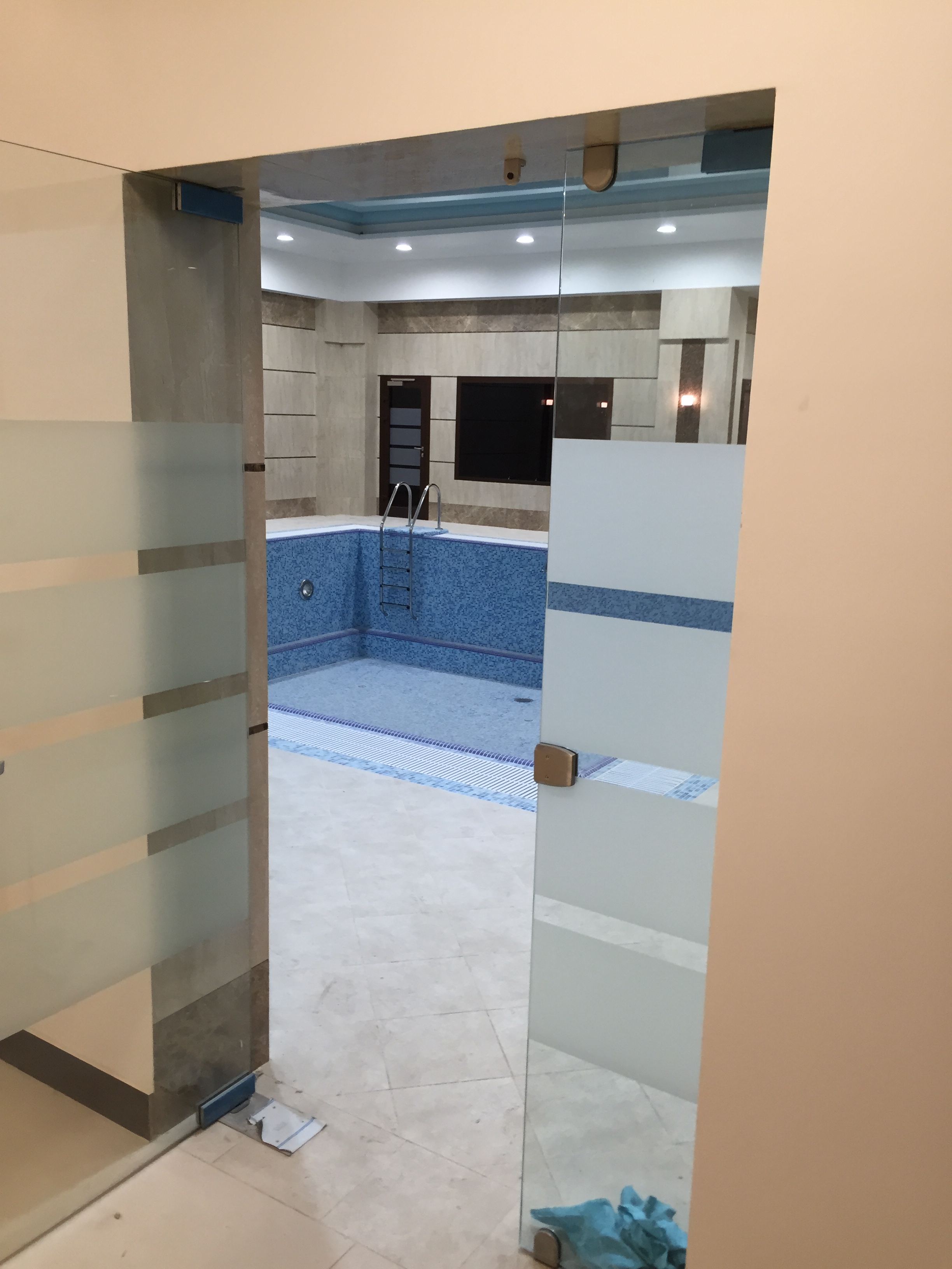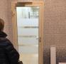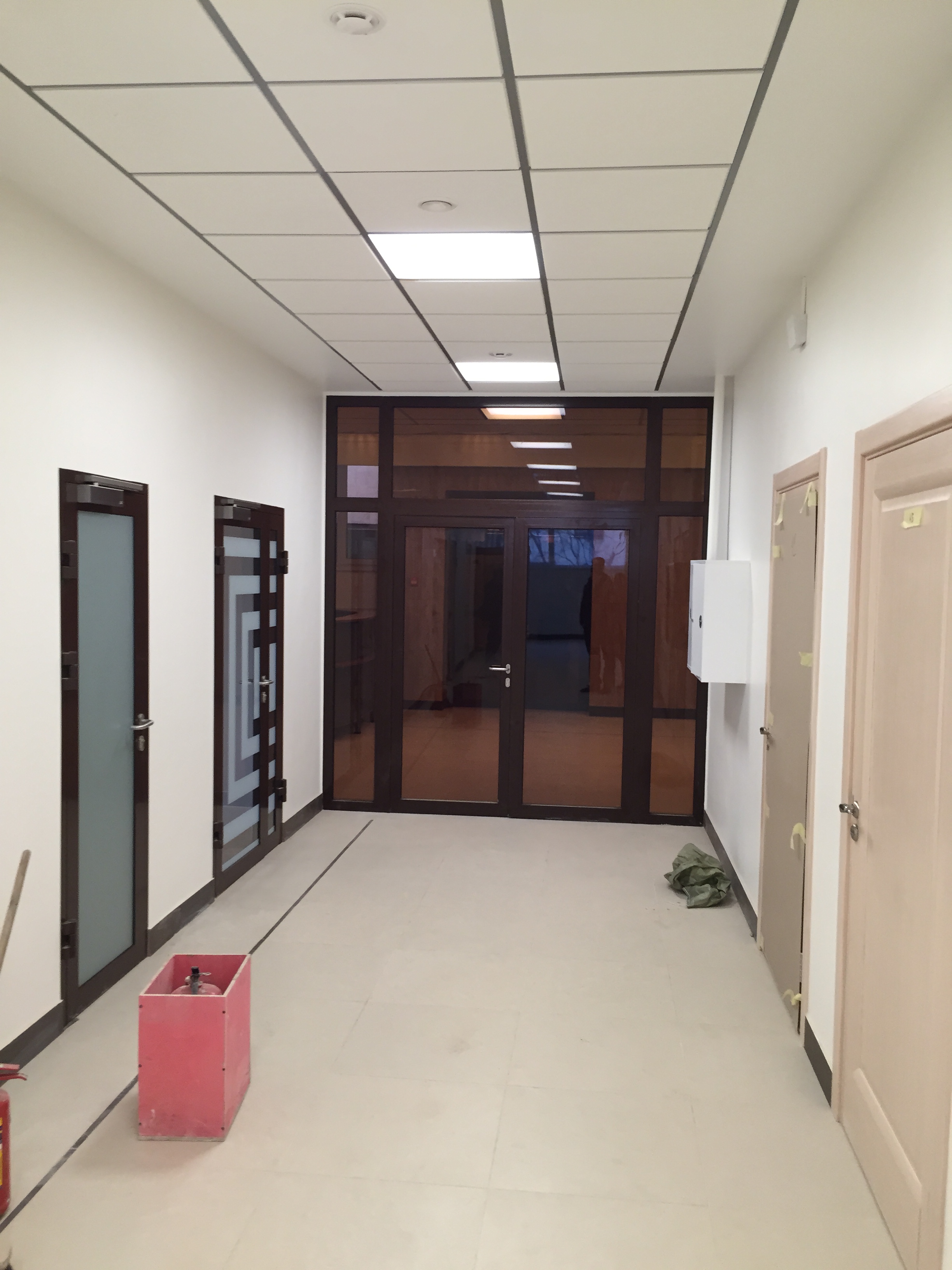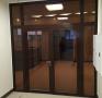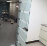Установка цельно-стеклянных дверей и конструкций из алюминиевого профиля окрашенного порошковой краской. Остекление на дверях задекорировано матовой пленкой.