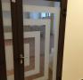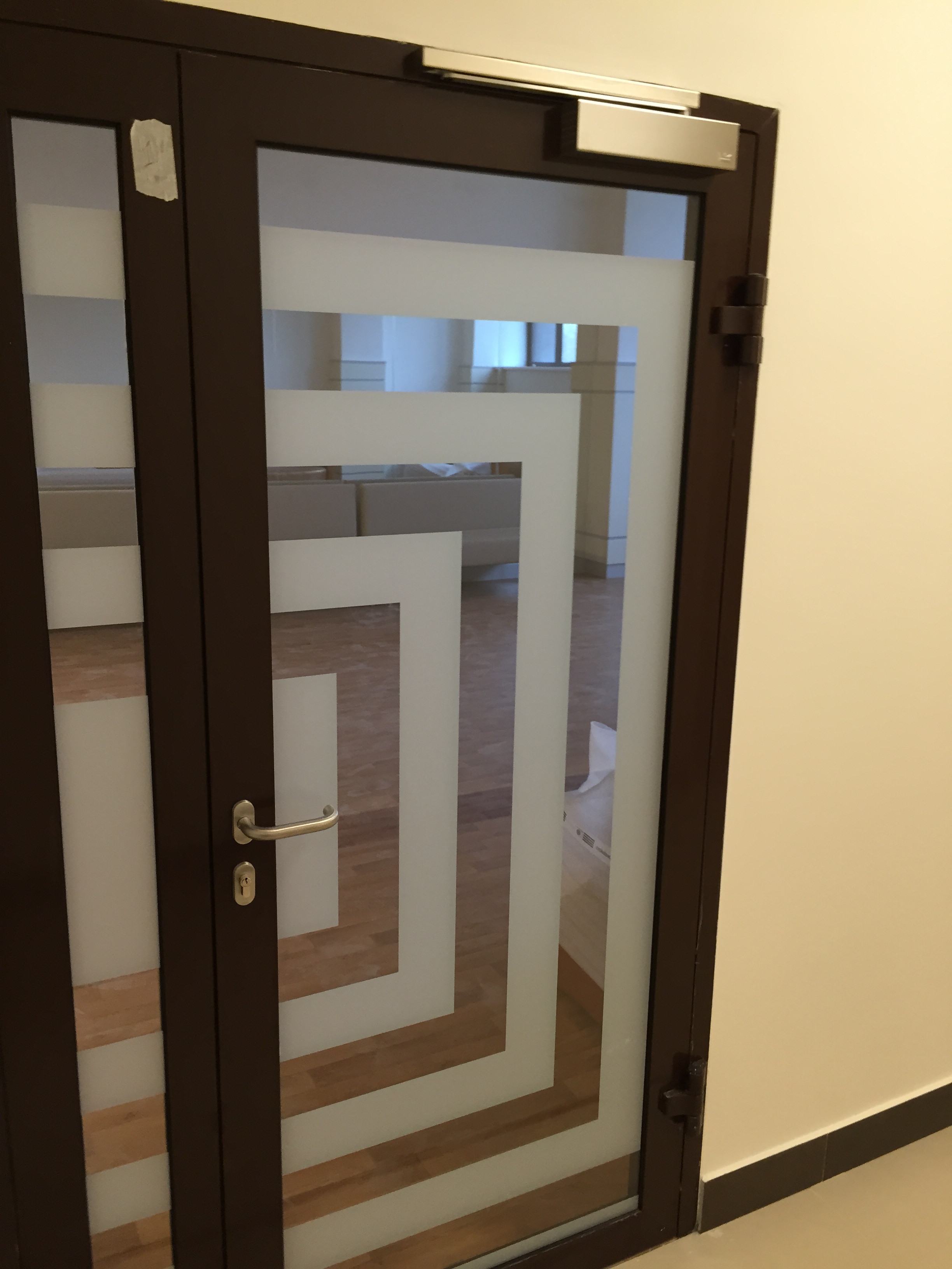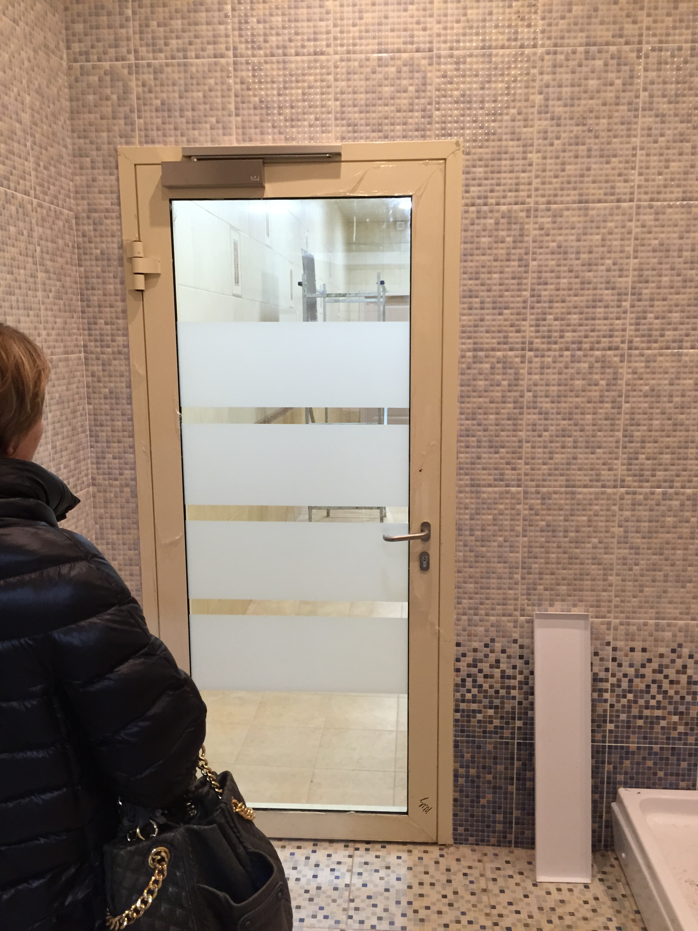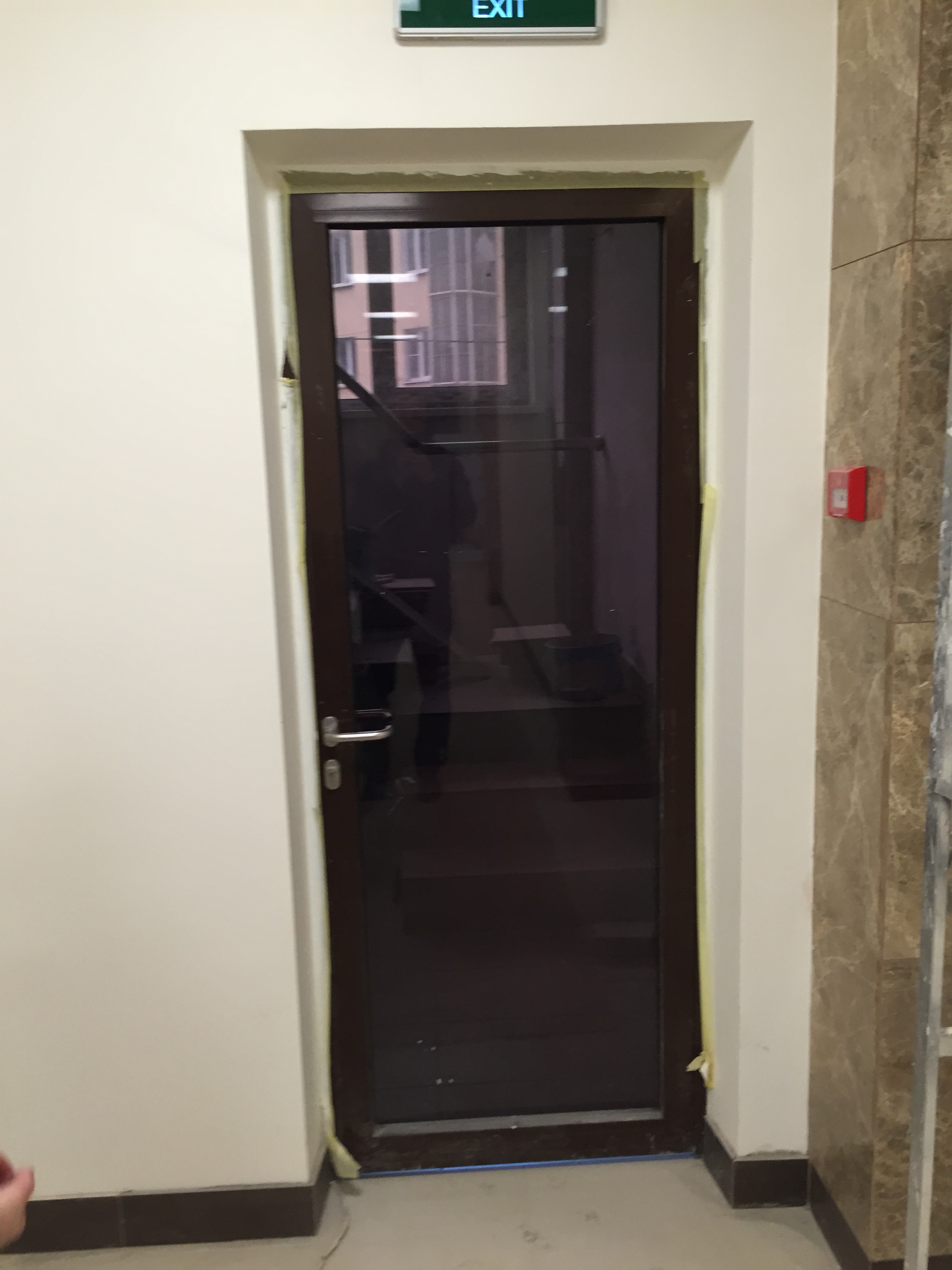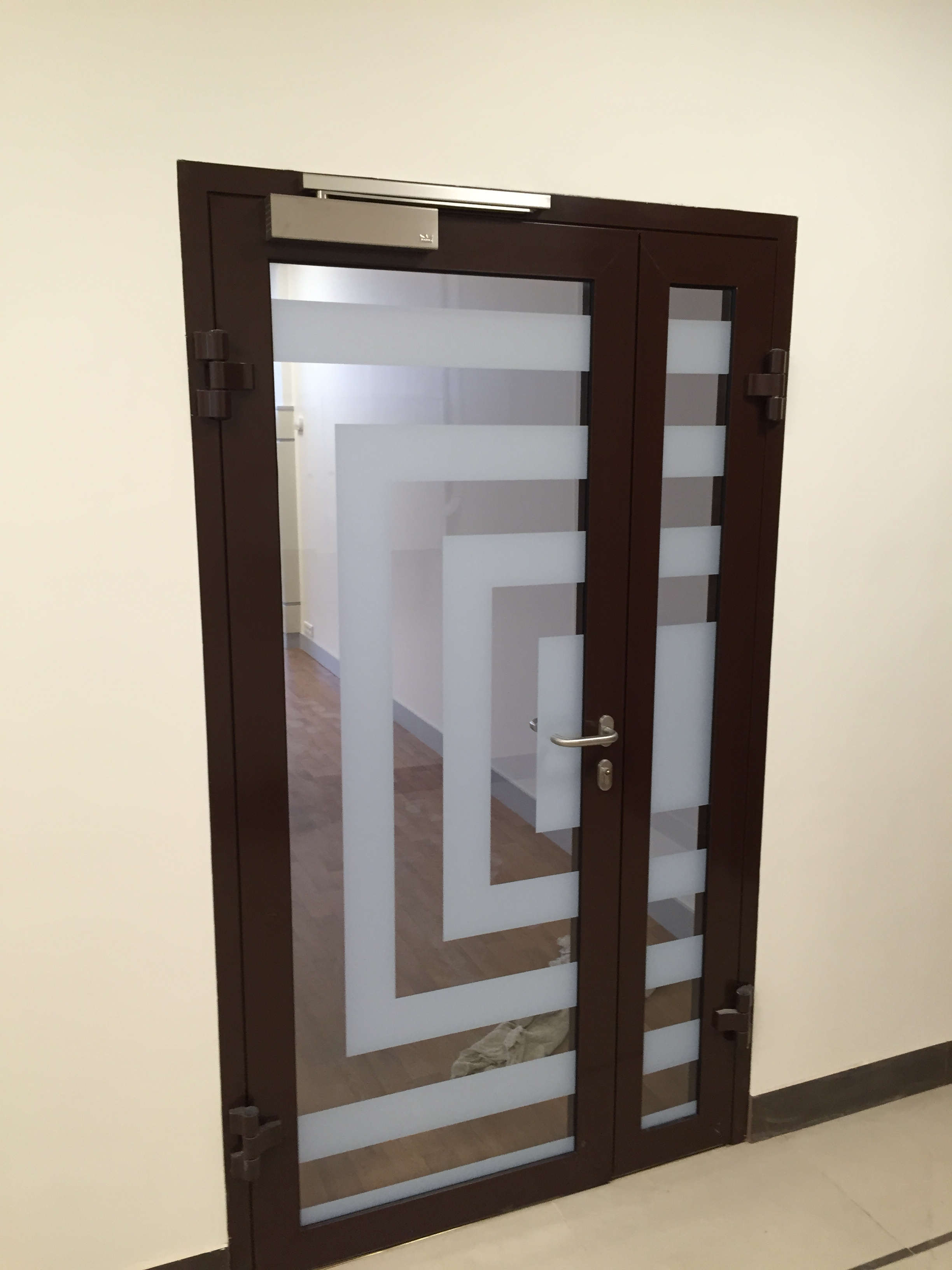 Установка цельно-стеклянных дверей и конструкций из алюминиевого профиля окрашенного порошковой краской. Остекление на дверях задекорировано матовой пленкой.